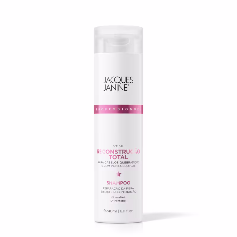 Jacques Janine Professionnel Reconstrução Total – Shampoo 240ml: promove uma reparação intensa dos cabelos danificados, quebradiços e com pontas duplas. Com a maior continuidade do uso, ocorre a reposição de proteínas nos fios frágeis e sensibilizados, deixando os cabelos fortes e com vitalidade. Sua fórmula rica em nutrientes promove a reparação e reconstrução das fibras capilares desde seu interior até a camada mais externas.