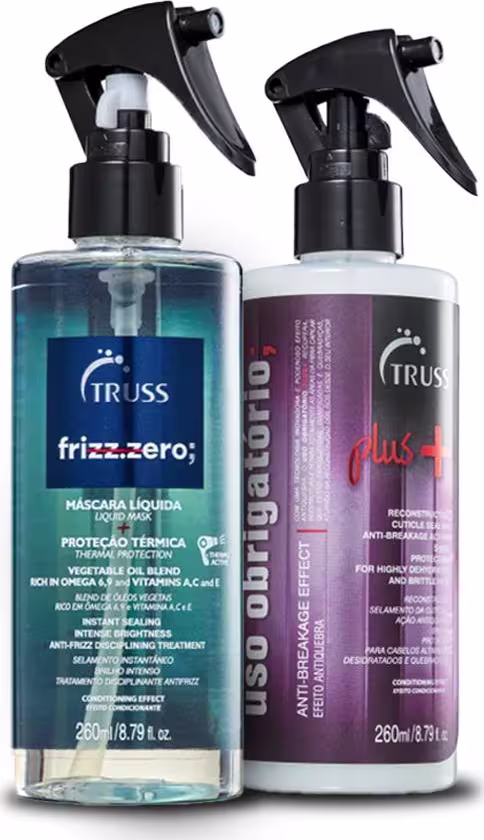 O Kit Truss Uso Obrigatório Plus 260ml e o Spray Finalizador Frizz Zero 260ml são produtos de cuidados capilares premium projetados para transformar a saúde e a aparência dos seus cabelos. Eles são formulados para oferecer resultados excepcionais, tornando seus cabelos mais bonitos, suaves e fáceis de gerenciar.