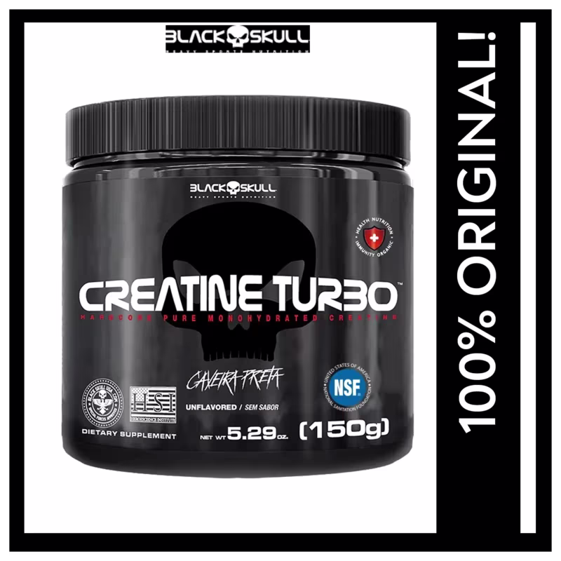 Suplemento alimentar de creatina. Black Skull Creatine Turbo auxilia no aumento de força, desempenho e desenvolvimento de massa, proporcionando melhor performance no treino.