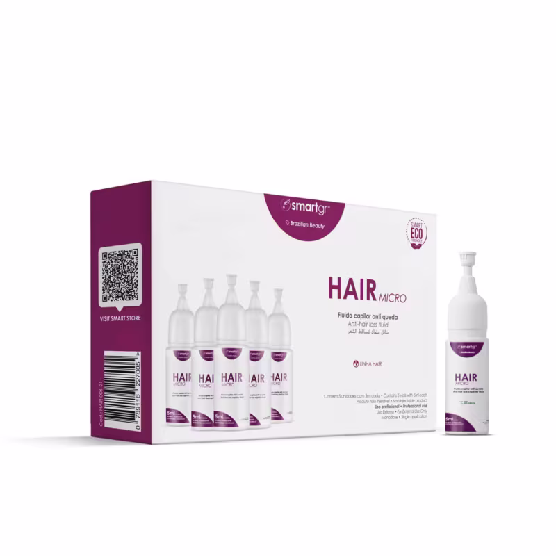 Hair Micro - Ativo de Terapia Capilar - 5 monodoses de 5 ml O Fluido concentrado Smart Hair Micro é uma monodose desenvolvida com a mais alta tecnologia, combina ingredientes como aminoácidos e extratos de plantas, tais como Achillea Millefolium, Cinchona Succiruba e Tussilago Farfara, ajudando na redução da queda de cabelo. Indicações Redução da queda capilar Vascularização + oxigenação no couro cabeludo Benefícios Reduz queda Estimula células tronco foliculares Estimula o aumento dos fios anágenos Reduz fios telógenos Estimula a síntese proteica (crescimento) Estimula a vascularização e oxigenação do couro cabeludo Ativos Colágeno vegetal Extrato de Alecrim Aminoácidos Fatores de crescimento Peptídeo Oligoelementos Cumarinas Óleo de Maracujá Óleo Resina de Copaíba (Copaifera officinalis) Como usar Uso profissional Aplicar sobre a pele na região a ser tratada até completa absorção. Associação Obtenha melhores resultados associando a linha Hair completa em seus tratamentos. Ingerir 2 cápsulas do Nutri Hair e usar o Hair Shampoo + Fluído capilar. Advertências e precauções Em caso de irritação suspender o uso. Manter fora do alcance de crianças. Evitar contato com os olhos. Em caso de contato acidental com os olhos, enxaguar abundantemente. Não ingerir. Em caso de ingestão, consultar o médico e apresentar a embalagem do produto. Manter o produto lacrado até o seu uso. Ao abrir a embalagem, utilizar o conteúdo total. Não injetável. Uso externo. Em caso de eventual irritação do couro cabeludo, suspender o uso. Especificações técnicas Embalagem: frasco de plástico Volume: 5 mL Uso: Profissional Tipo de pele: todos os tipos de pele Conteúdo da embalagem: 5 Frascos de 5 ml Quem viu este produto, tam