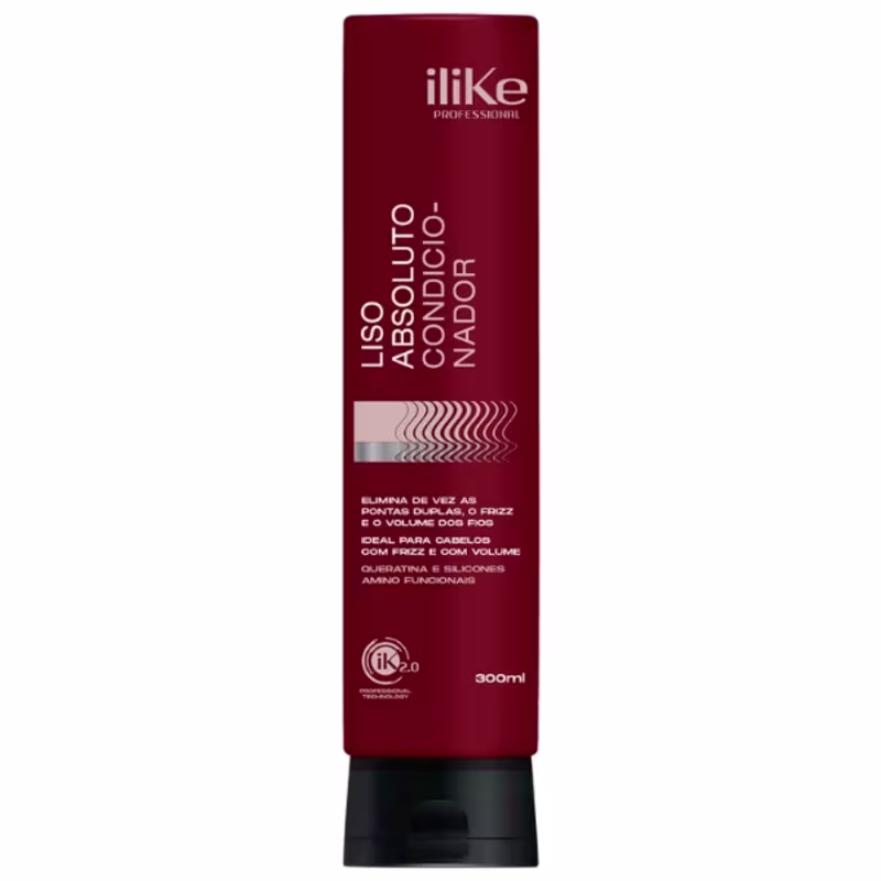 O Condicionador iLike Liso Absoluto é um Condicionador de tratamento indicado para todos os tipos de cabelos, que confere ação antivolume e antifrizz, auxiliando na redução das pontas duplas. Doa maciez, emoliencia e brilho radiante ao cabelo, além de promover efeito extremamente liso e maravilhoso. Tudo isso em uma fórmula enriquecida com Queratina e Silicones Aminofuncionais, responsáveis por tratar os fios e protege-los contra os agentes externos, assim como ferramentas de calor.