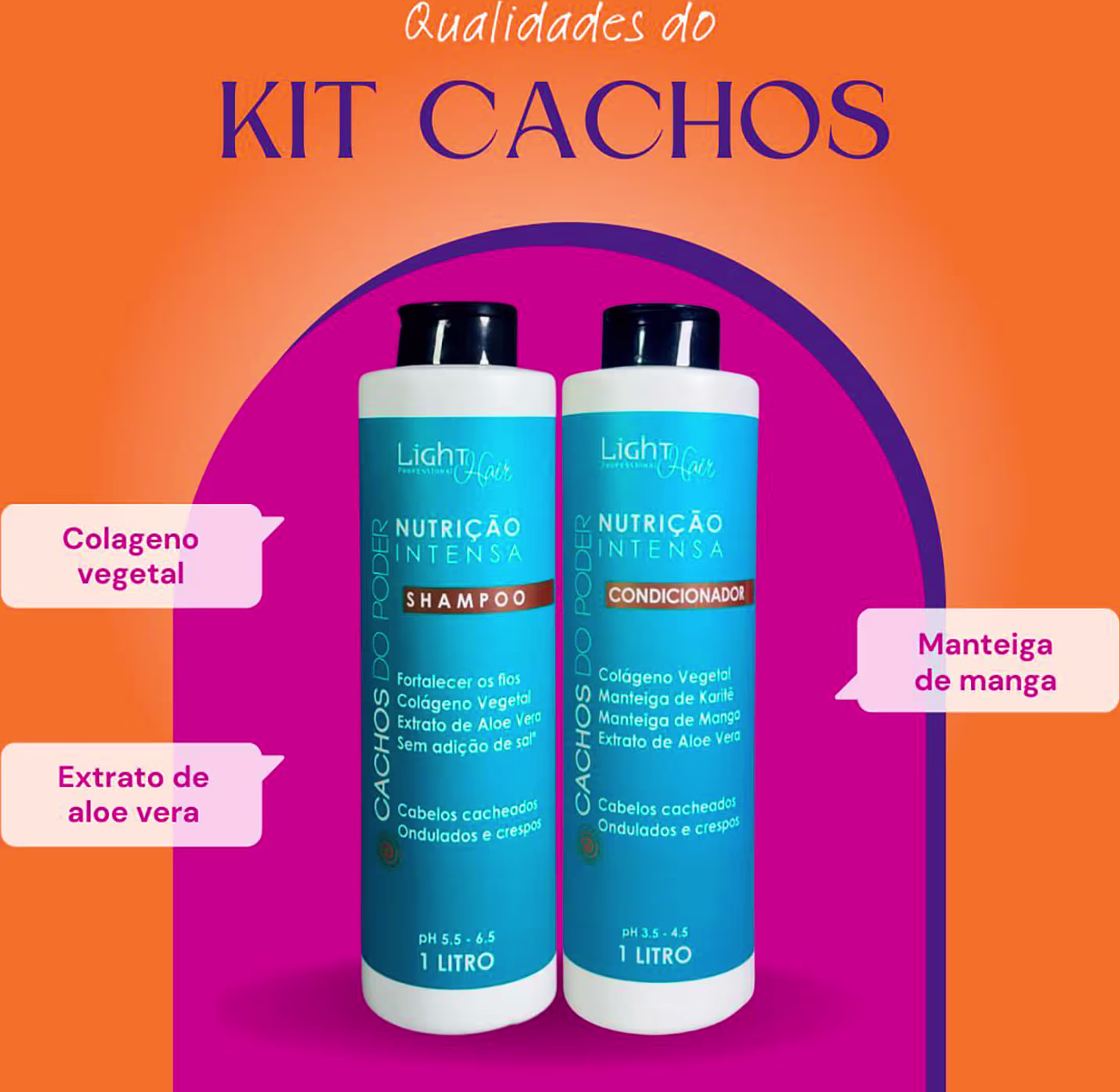 O Condicionador Cachos do Poder Light Hair Professional contém o poderoso Colágeno Vegetal, Aloe Vera e a Manteiga de Manga que juntos tem a capacidade de hidratar e fechar as cutículas dos cabelos. Fortalece, promove nutrição e restaura a elasticidade dos fios.