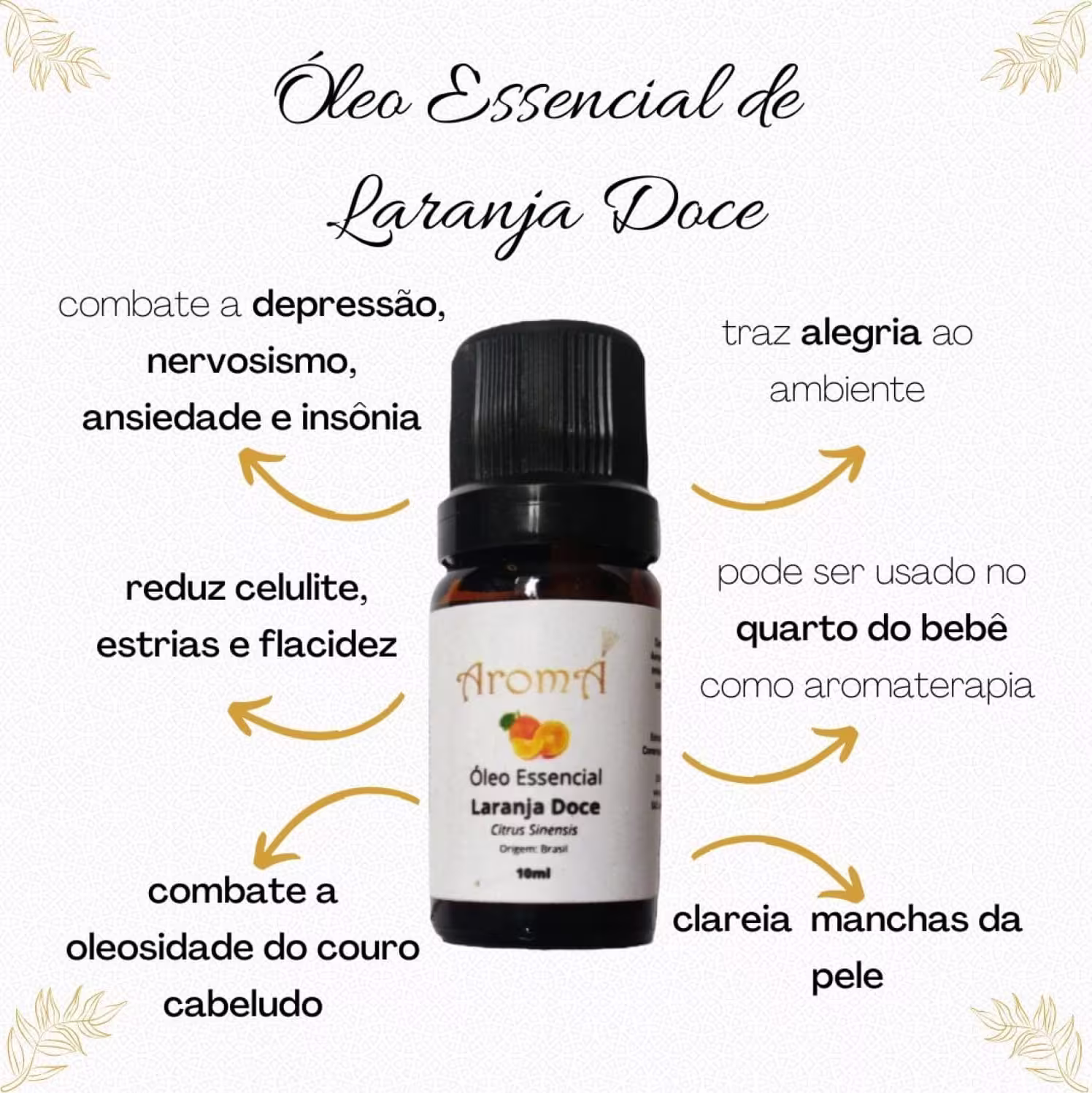 O óleo essencial de laranja doce (Citrus sinensis) Aromá combate a depressão, nervosismo, ansiedade e a insônia. Aumenta a imunidade. Traz alegria ao ambiente e estimula a criatividade. É conhecido como óleo da alegria.