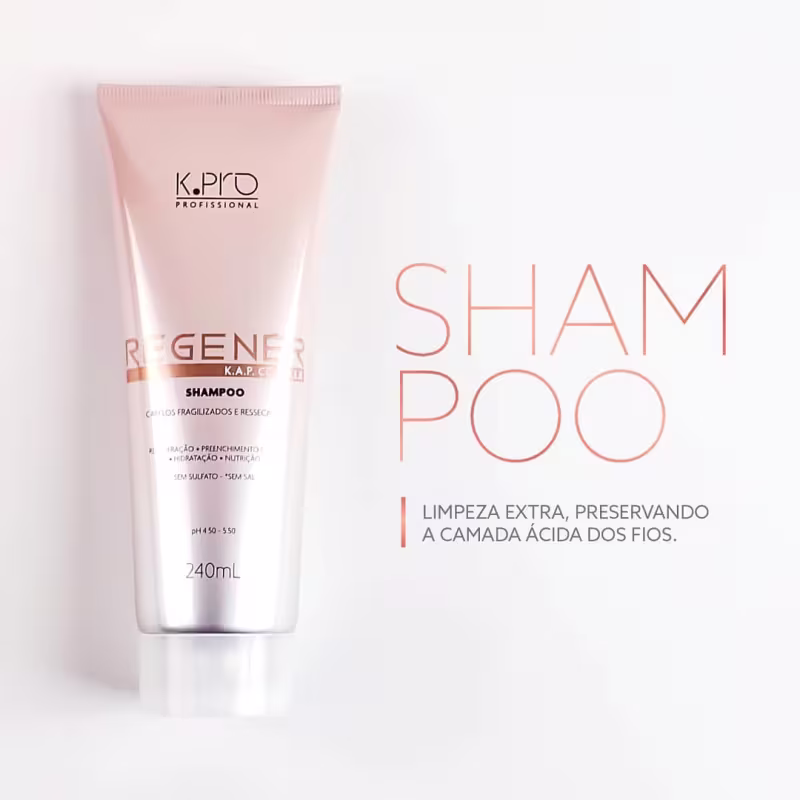 K.Pro Profissional Regenér - Shampoo 240ml: é enriquecido com ácido hialurônico, que ajuda a preencher as partes porosas do fio com muita hidratação e maciez. Além disso, preserva o pH naturalmente ácido dos fios para que as cutículas fiquem seladas e proporcionem brilho extra. Tudo isso, com uma espuma densa, cremosa e muito luxuosa.