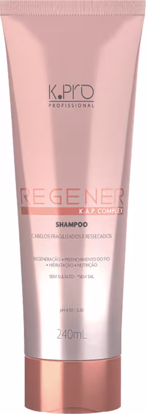 K.Pro Profissional Regenér - Shampoo 240ml: é enriquecido com ácido hialurônico, que ajuda a preencher as partes porosas do fio com muita hidratação e maciez. Além disso, preserva o pH naturalmente ácido dos fios para que as cutículas fiquem seladas e proporcionem brilho extra. Tudo isso, com uma espuma densa, cremosa e muito luxuosa.