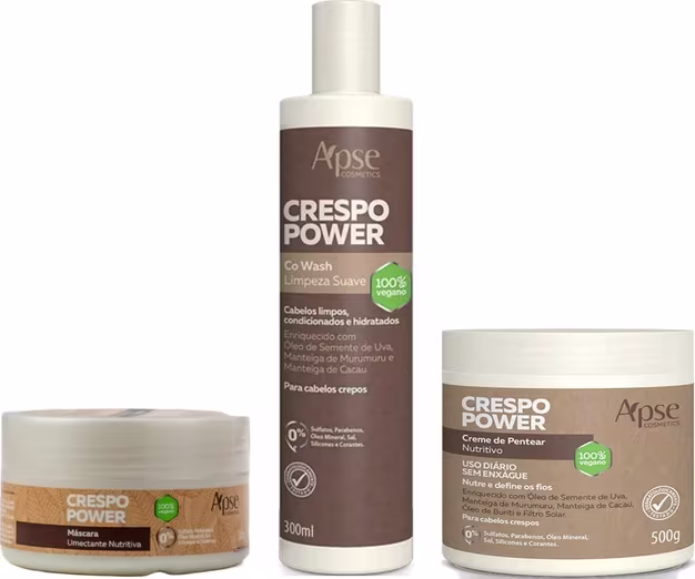 Kit Apse composto por 1 Crespo Power Co Wash 300 ml, 1 Crespo Power Creme de Pentear 500 gr e 1 Crespo Power Máscara 300 gr Crespo Power Co Wash 300 ml Higieniza os cabelos crespos sem agredir o couro cabeludo e promovendo nutrição aos fios. Juntamos 3 maravilhosos ativos vegetais para deixar os fios nutridos, macios e brilhosos! Liberado para No poo. Uso diário Para cabelos crespos, cacheados ou com alta porosidade. pH 3,5 - 4,5 aproximadamente. Enriquecido com: Óleo de semente de uva: Ativo altamente hidratante. Atua na prevenção da queda, evita que os fios se tornem quebradiços, fortalece os fios, além de auxiliar no crescimento capilar. Manteiga de Murumuru: Indicada para reconstrução dos fios danificados, preenche as fissuras e alinha as cutículas, devolvendo sua elasticidade natural. Manteiga de Cacau: Possui propriedades hidratantes e emolientes. Tem a capacidade de regenerar a fibra capilar, deixando-a macia e mais maleável. Modo de usar: aplique uma quantidade suficiente do Apse Crespo Power Co Wash e massageie bem no couro cabeludo e fios. Enxágue bem, removendo o produto, caso necessário repita a operação. Após utilize o Apse Crespo Power Condicionador maior condicionamento dos fios caso ache necessário. Crespo Power Creme de Pentear 500 gr Produto desenvolvido com fórmula nutritiva, rica em óleos e manteigas vegetais, para proporcionar cabelos macios, leves e soltos. Os cabelos crespos merecem um cuidado especial, juntamos maravilhosos ativos vegetais para deixar os fios nutridos, macios e brilhosos! Contém filtro solar! Uso diário, sem enxágue. Não deixa resíduo! Liberado para No Poo e Low Poo Enriquecido com: Óleo de Semente de Uva: ativo altamente hidratante. Atua na prevenção da queda, evita que os fios se tornem quebradiços, fortalece os fios, além de auxiliar no crescimento capilar. Manteiga de Murumuru: indicada para reconstrução dos fios danificados, preenche as fissuras e alinha as cutículas, devolvendo sua elasticidade natural. Manteiga de Cacau: possui propriedades hidratantes e emolientes. Tem a capacidade de regenerar a fibra capilar, deixando-a macia e mais maleável. Óleo de Buriti: protege a queratina e o colágeno presentes no fio de cabelo, auxiliando o seu fortalecimento e evitando, consequentemente, a quebra, o frizz e as pontas duplas. Filtro solar natural. Desenvolvido para cabelos crespos! Modo de usar: após lavar o cabelo com a linha Apse Crespo Power, aplique o Apse Crespo Power Creme de Pentear nos cabelos úmidos e aplique a técnica de fitagem que você mais gosta. Crespo Power Máscara 300 gr Os cabelos crespos merecem um cuidado especial, juntamos 3 ativos vegetais maravilhosos para deixar os fios nutridos, macios e com brilhosos! Liberado para No Poo Enriquecido com: Óleo de Semente de Uva: ativo altamente hidratante. Atua na prevenção da queda, evita que os fios se tornem quebradiços, fortalece os fios, além de auxiliar no crescimento capilar. Manteiga de Murumuru: indicada para reconstrução dos fios danificados, preenche as fissuras e alinha as cutículas, devolvendo a sua elasticidade natural. Manteiga de Cacau: possui propriedades hidratantes e emolientes. Tem a capacidade de regenerar a fibra capilar, deixando-a macia e mais maleável. Desenvolvido para cabelos crespos. Ph 3,5 a 4,5 aproximadamente. Modo de usar: Após lavar o cabelo com a linha Apse Crespo Power, aplique a Apse Crespo Power Máscara nos cabelos. Massageie e deixe agir por até 15 minutos. Enxague bem. Sobre a marca: Apse Cosmetics, nascida para cuidar de você! Fazendo diferença para o seu dia a dia, com fórmulas ricas em ativos naturais que trazem o melhor tratamento para o seu cabelo, e sem causar danos ao meio ambiente. Todos os produtos Apse Cosmetics são 100% Veganos, Livres de Sulfatos, Silicone e Parabeno (Low/No Poo) e Dermatologicamente testados.