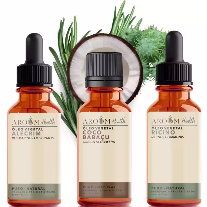 Óleo vegetal puro de Alecrim: Estimula a circulação sanguínea no couro cabeludo, o que pode favorecer o crescimento capilar e combater os danos dos radicais livres, mantendo os cabelos fortes e saudáveis.