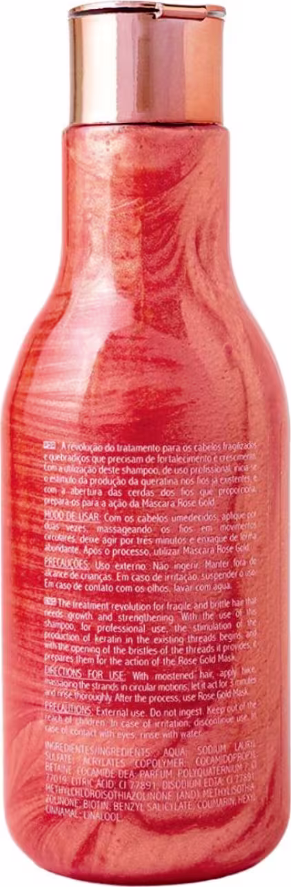 Shampoo Rose Gold 300ml: A revolução do tratamento para os cabelos fragilizados e quebradiços que precisam de crescimento e fortalecimento. Com a utilização deste shampoo, inicia-se o estímulo da produção da queratina nos fios já existentes.