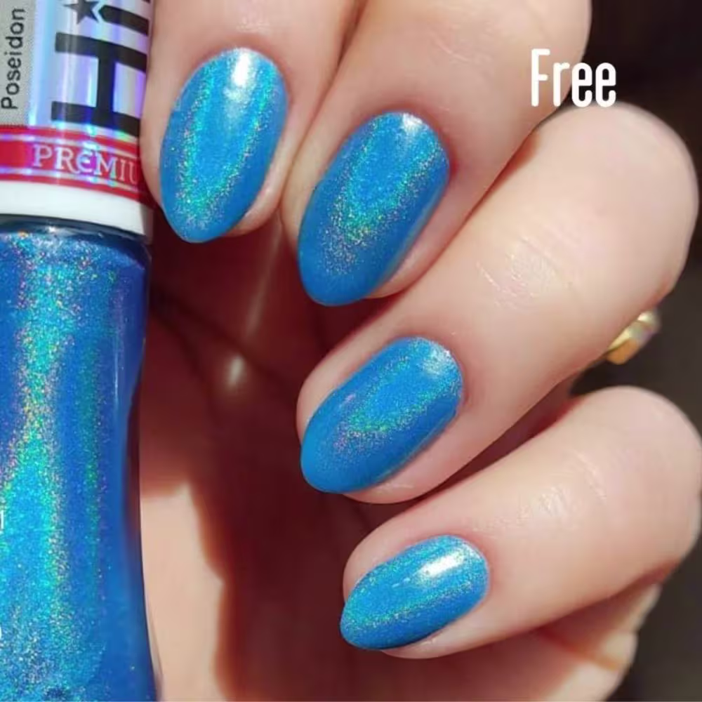 Esmalte Holográfico Poseidon: O esmalte holográfico azul Poseidon da Coleção Hits no Olimpo, é um azul cheio de vida e que proporcionará um efeito encantador em suas unhas. Os esmaltes holográficos levam um pigmento nobre em sua composição, o que o enquadra na categoria de esmaltes premium. As matérias-primas são de altíssima qualidade e a Hits se compromete com o desenvolvimento de produtos que atendem aos mais variados gostos e necessidades de suas consumidoras. Se nunca usou um esmalte holográfico, você precisa ter essa experiência nas unhas. O efeito sob a luz do sol é único e arrasador.