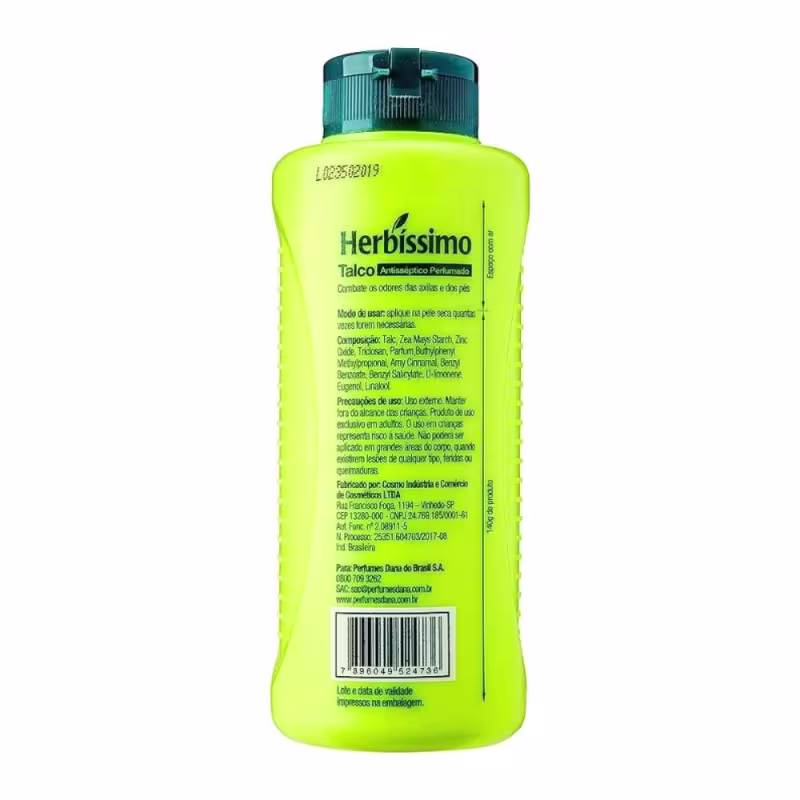 O novo Talco Antisséptico Herbíssimo conta com uma suave fragrância unissex exclusiva, que ao mesmo tempo protege e deixa um agradável perfume. Especialmente desenvolvido para ser utilizado no dia a dia, tanto nas axilas como nos pés, auxiliando na prevenção de odores, assaduras, brotoejas, coceira e irritações. Permite que os pés e axilas respirem, proporcionando uma agradável sensação de bem estar.