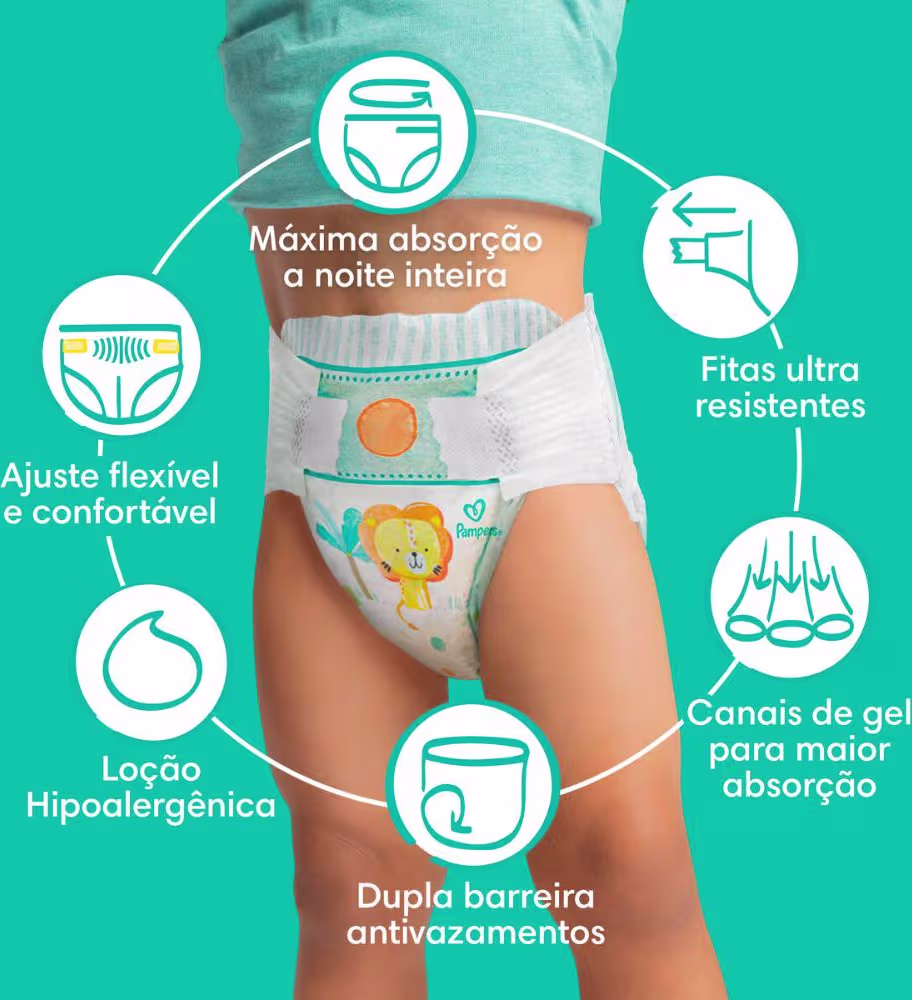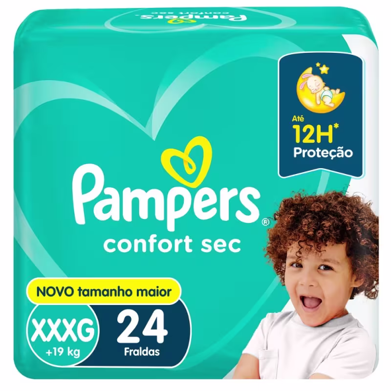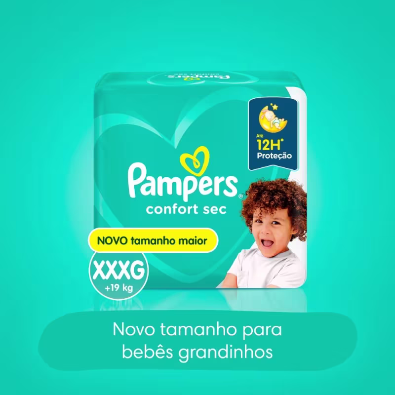 A fralda Pampers Confort Sec com máxima absorção a noite inteira até 12 horas seco*.