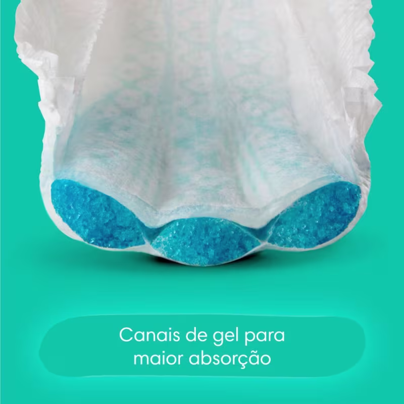 A fralda Pampers Confort Sec possui canais de gel, são 3 canais absorventes extras que distribuem o xixi e ajudam a evitar que a fralda fique caída. Com barreiras antivazamentos reforçadas que se adaptam suavemente ao redor das pernas do seu bebê.