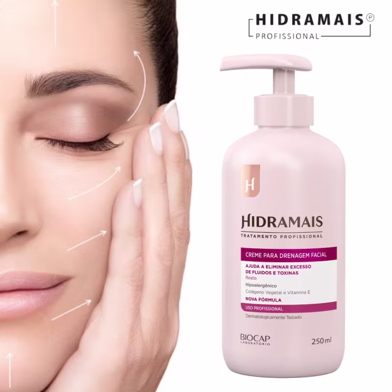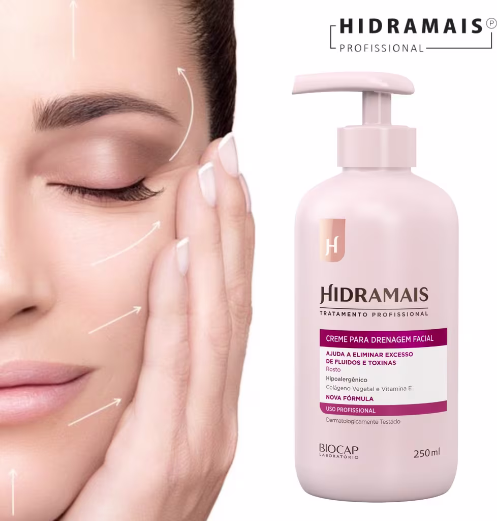 A Creme para Drenagem Facial Hidramais proporciona firmeza a pele, melhora a microcirculação, reduz o inchaço, a retenção de líquidos e processos inflamatórios, além de reforçar a produção de colágeno.