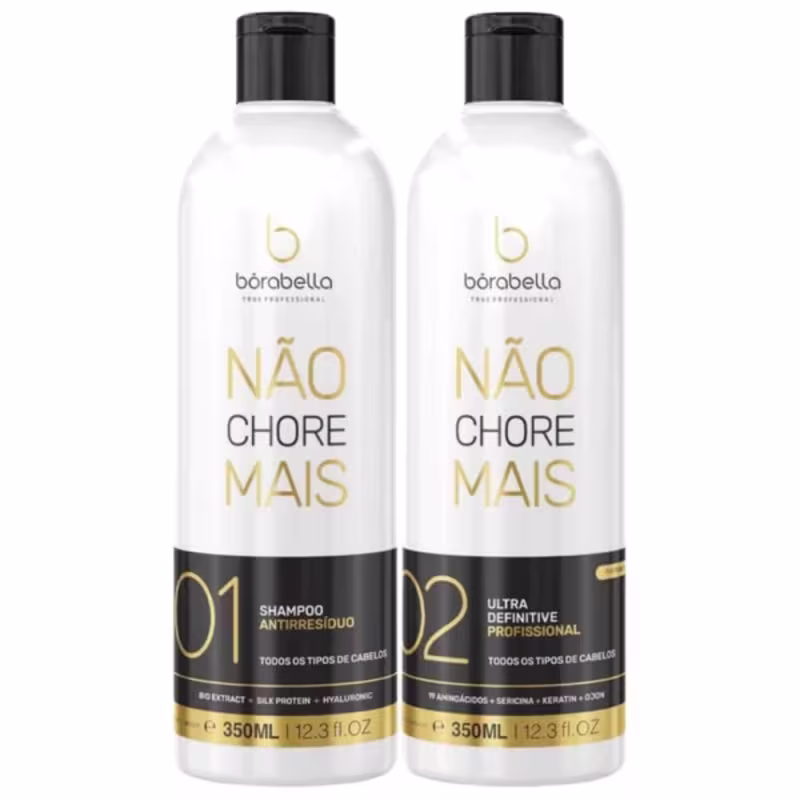 O Kit Borabella Not Cry More Progressiva Duo é formulado com Blend de Ácidos e Aminoácidos, Proteína da Seda e Óleos de Coco e Ojon, que proporcionam fios 100% lisos, hidratados, brilhantes e macios, combatendo a desidratação, o ressecamento e o frizz. Além disso, protege os cabelos contra os danos externos, como sol, cloro, poluição e contra danos mecânicos como os causados por secador e chapinha.