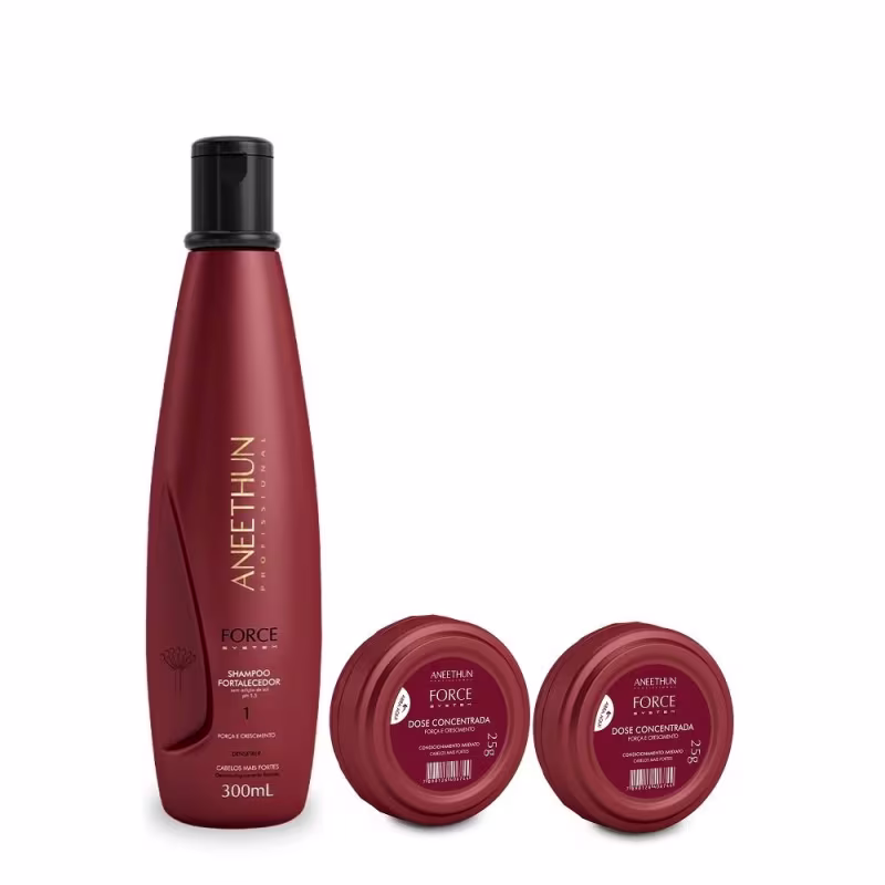 Shampoo para cabelos enfraquecidos. Aneethun Force System recupera os fios de forma intensa, impulsionando o crescimento capilar.