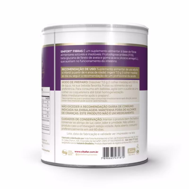 Não sei o CEPSIMFORT® FIBRAS Vitafor é um mix de fibras solúveis e insolúveis [Frutooligosacarídeos (FOS), beta-glucana de farelo de aveia e goma acácia (Acacia senegal L.)] com ação prebiótica, contribuindo para o funcionamento intestinal. Pode ser diluído em água ou na sua bebida favorita, frutas ou alimento de sua preferência