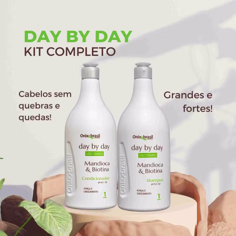 Condicionador Day By Day Mandioca e Biotina 1L: Após o uso do shampoo, este condicionador nutre profundamente os cabelos, deixando-os mais macios e fáceis de pentear. Sua fórmula exclusiva fortalece os fios, proporcionando resistência e brilho.