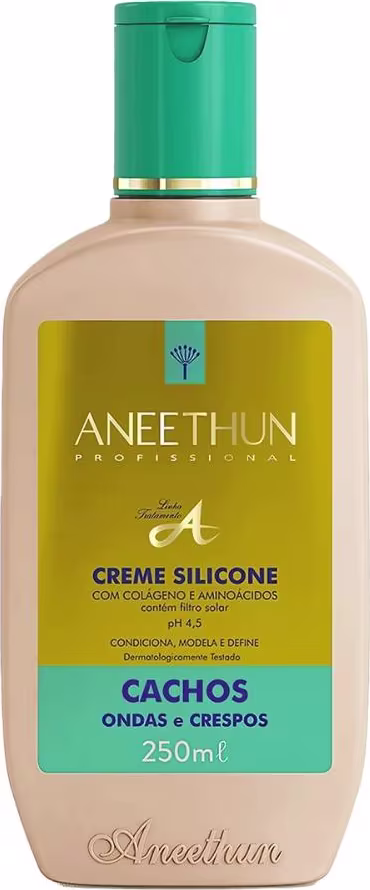 Aneethun Linha A Cachos Ondas e Crespos - Creme de Silicone 250ml: tem fórmula rica em Colágeno, Silicone e Aminoácidos para nutrir e hidratar profundamente, além de fortalecer e recuperar as pontas duplas. Além disso, também oferece proteção solar e térmica.
