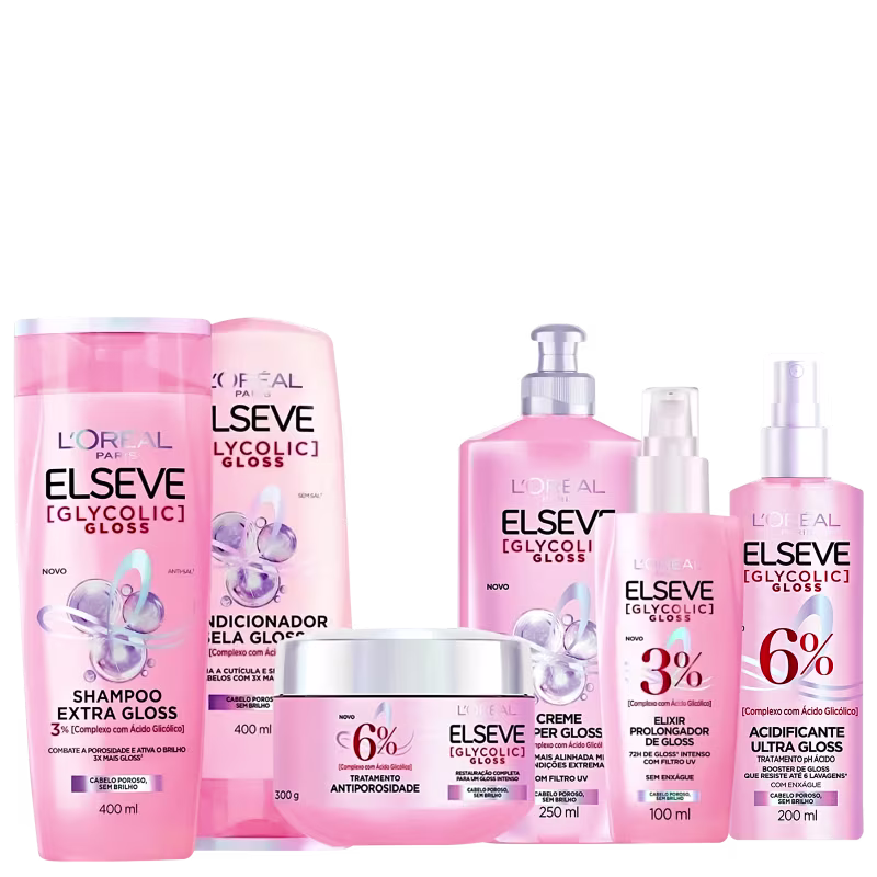 A tecnologia de Elseve Glycolic Gloss garante brilho ultra gloss, durando até 6 lavagens e isso acontece pois sua fórmula com pH Ácido é rica em Ácido Glicólico, que atua no cabelo combatendo a porosidade e selando as cutículas dos fios, sendo indicado para todos os tipos de cabelos. O Acidificante Ultra Gloss é o tratamento ácido que combate a porosidade dos fios desde o primeiro uso para impulsionar o gloss no cabelo. Quando o cabelo é exposto a um pH alto, fica poroso, com as cutículas abertas e perde o gloss. A nossa fórmula inovadora com 6% [Complexo com Ácido Glicólico] e pH ácido lamina as cutículas e corrige as falhas da fibra. Cabelo visivelmente saudável e alinhado para um brilho gloss intenso que resiste por até 6 lavagens.
