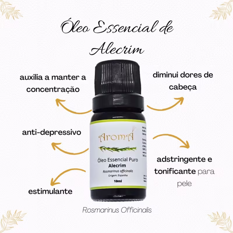 O óleo essencial de alecrim (Rosmarinus Officinalis) Aromá é conhecido por seu poder estimulante e anti-depressivo. Possui diversos benefícios:
