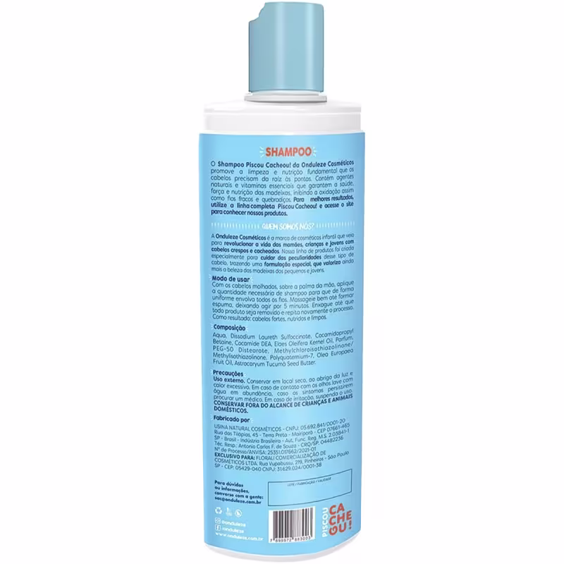 O Shampoo Nutritivo Onduleze Cosméticos Piscou Cacheou! possui uma composição especialmente desenvolvida com ingredientes naturais que promovem máxima limpeza aos delicados cachos infantis, eliminado resíduos e diminuído a agressão a fibra capilar, o que garante fios mais fortes, bonitos e saudáveis. É um produto dermatologicamente testado e destinado a crianças a partir de 1 ano de idade.