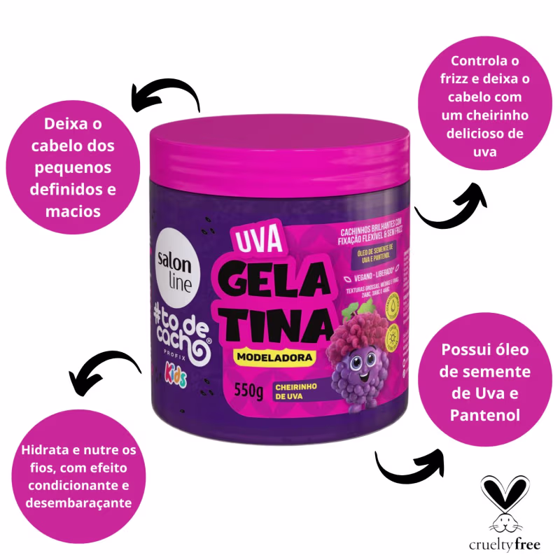 A Gelatina Modeladora com Cheirinho de Uva é perfeita para deixar os cachinhos dos pequenos definidos, macios e com um cheirinho delicioso de uva. Sua fórmula vegana e liberada hidrata e nutre os fios, com efeito condicionante e desembaraçante além de controlar o frizz. Possui óleo de semente de Uva e Pantenol proporcionando brilho intenso e fixação flexível.