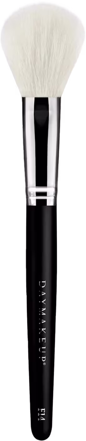 Aplicação de iluminador e blush. Pelos naturais de cabra DAYTECH Soft Hair™, cabo de madeira com ponteira em cobre prata.