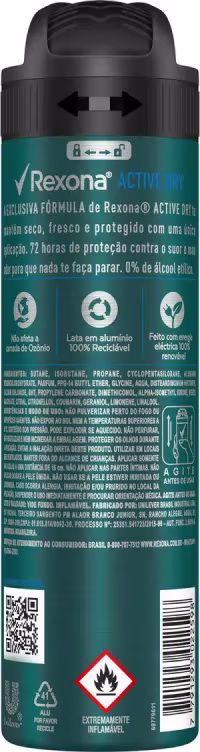 Rexona Men Active Dry é um desodorante antitranspirante que oferece a você 72h de proteção contra a transpiração e o mau odor, em uma fórmula inovadora e livre de álcool etílico.