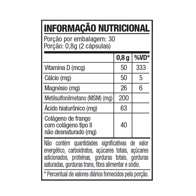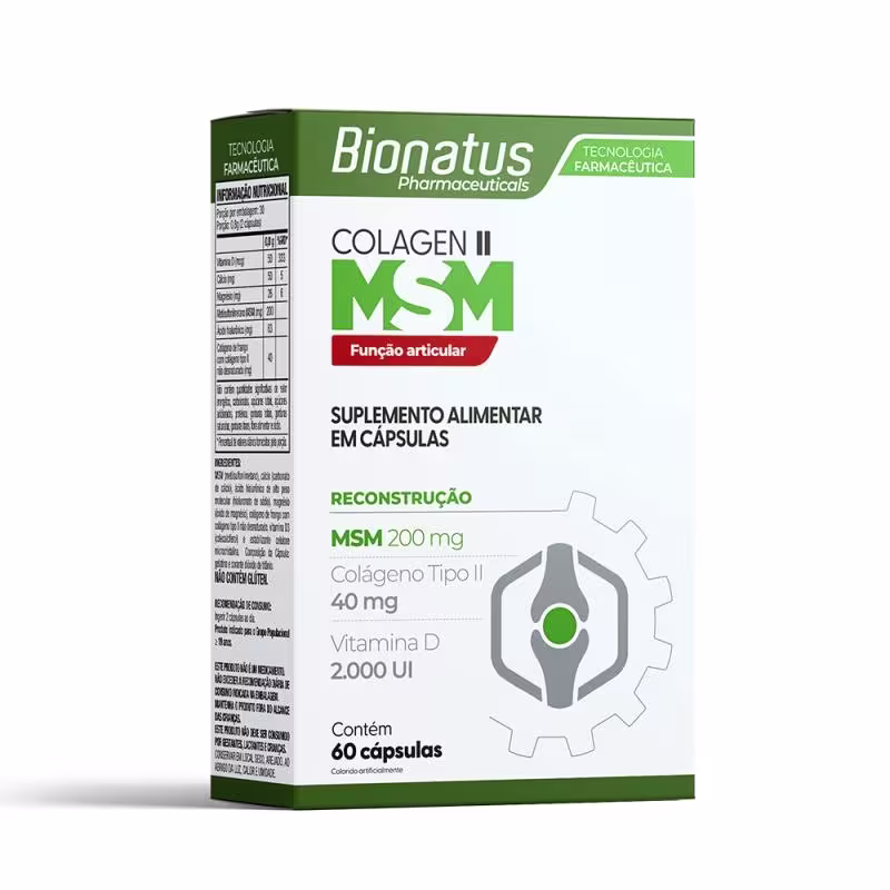 Com uma formula avançada, contendo Vitamina D, Calcio, Magnésio, Metilsulfonilmetano (MSM), Acido Hialuronico e Colageno tipo II, o colagen II MSM irá auxiliar na saúde articular, melhorando inflamações, manutenção do cálcio, hidratação, flexibilidade e mobilidade.