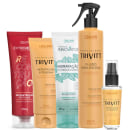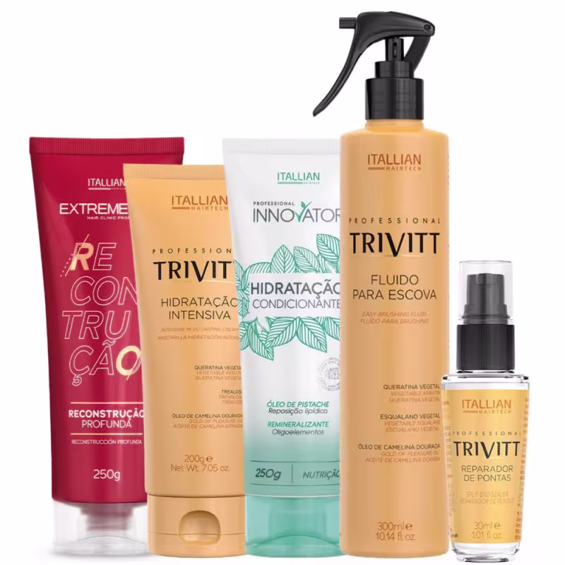 Não sei o CEPContém:- fluido para escova trivitt 300ml- hidratacao condicionante innovator 250g- hidratacao intensiva trivitt 200g- reconstrucao profunda extreme-up 250g- reparador de pontas trivitt 30mlO fluido para escova Trivitt é um produto para cabelos que contém proteção térmica e ajuda a evitar as pontas duplas. Sua fórmula contém filtro solar, queratina, óleo de Camelina Dourada e emulsão de silicone, que juntos restauram as partes danificadas dos fios, reequilibram o teor de água e a distribuição de cargas elétricas da fibra capilar, além de proporcionar brilho intenso e maciez. O produto deve ser vaporizado em pequenas quantidades nos cabelos limpos e úmidos, mantendo a embalagem na posição vertical e a uma distância de aproximadamente 20 cm, antes de proceder à escova com secador.A Hidratação Condicionante Innovator é um produto altamente nutritivo que hidrata e condiciona os cabelos em poucos minutos. Sua fórmula contém ativos tecnológicos como o óleo de pistache, que proporciona maleabilidade, evita a perda de hidratação, nutre a fibra capilar e alivia a irritação do couro cabeludo. Além disso, sua composição conta com oligoelementos extraídos da água do mar que reforçam as ligações de hidrogênio e promovem o estímulo celular nos folículos pilosos. Para completar, o blend vegetal de babaçu, coco e soja reorganiza as cutículas, protege os cabelos das agressões externas e confere brilho acentuado. O modo de uso é simples: após lavar os cabelos com o Shampoo sem Sulfato Innovator, basta aplicar a Hidratação Condicionante no comprimento e pontas, deixar agir por 3 a 5 minutos e enxaguar. Para quem deseja escovar os cabelos com secador, recomenda-se o uso do Sérum Remineralizante Innovator. Em resumo, a Hidratação Condicionante Innovator é um produto completo que oferece diversos benefícios aos cabelos, desde hidratação profunda até proteção contra agressões externas e brilho radiante.A Hidratação Intensiva é recomendada para todos os tipos de cabelo, pois repara danos, hidrata, dá brilho e condiciona os fios. Ela penetra na fibra capilar e fortalece os fios contra a quebra com ingredientes altamente hidratantes, que selam as cutículas e repõem a hidratação perdida por mais tempo. Os ativos incluem Trealose, que hidrata profundamente e protege contra agentes externos, Queratina, que restaura os fios e mantém as cutículas seladas, e Óleo de Camelina Dourada, que restaura o teor lipídico, combate o toque áspero e recupera a elasticidade dos fios. O modo de uso é aplicar nos cabelos limpos e úmidos, massageando suavemente mecha por mecha, deixando agir por 5 minutos e enxaguando. Para escovar com secador, é recomendado aplicar antes o Fluido para Escova Trivitt.Com a Reconstrução Profunda, restaura os fios do comprimento às pontas, devolvendo a força natural dos cabelos, deixando-os ainda mais brilhantes e macios. Com ativos como o Concentrado de Aminoácidos Vegetais, que aumenta a resistência, redensifica os fios, forma um filme hidratante e protetor, recuperando a integridade da fibra capilar. Além disso, conta com Polímero de condicionamento catiônico que mantém a espuma densa, cremosa e estável, promovendo penteabilidade e maciez aos cabelos úmidos. O modo de uso é simples: Após a aplicação do Shampoo de Reconstrução Extreme Up, aplique a Reconstrução Profunda em todo o comprimento e pontas, massageando, deixe agir por 5 minutos e enxágue.O Trivitt Reparador de Pontas é um produto para todos os tipos de cabelo que recupera o brilho, repara as pontas duplas e condiciona os fios. Sua tecnologia com silicones forma uma película protetora que deixa os fios macios e com brilho luminoso, sem deixá-los pesados ou oleosos. Além disso, possui filtro solar que protege os cabelos contra os danos provocados pela radiação UV-B. Para usar, basta espalhar algumas gotas nas mãos e aplicar nas pontas dos cabelos.