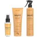Não sei o CEPContém:- fluido para escova trivitt 300ml- hidratacao intensiva trivitt 200g- reparador de pontas trivitt 30mlO fluido para escova Trivitt é um produto para cabelos que contém proteção térmica e ajuda a evitar as pontas duplas. Sua fórmula contém filtro solar, queratina, óleo de Camelina Dourada e emulsão de silicone, que juntos restauram as partes danificadas dos fios, reequilibram o teor de água e a distribuição de cargas elétricas da fibra capilar, além de proporcionar brilho intenso e maciez. O produto deve ser vaporizado em pequenas quantidades nos cabelos limpos e úmidos, mantendo a embalagem na posição vertical e a uma distância de aproximadamente 20 cm, antes de proceder à escova com secador.A Hidratação Intensiva é recomendada para todos os tipos de cabelo, pois repara danos, hidrata, dá brilho e condiciona os fios. Ela penetra na fibra capilar e fortalece os fios contra a quebra com ingredientes altamente hidratantes, que selam as cutículas e repõem a hidratação perdida por mais tempo. Os ativos incluem Trealose, que hidrata profundamente e protege contra agentes externos, Queratina, que restaura os fios e mantém as cutículas seladas, e Óleo de Camelina Dourada, que restaura o teor lipídico, combate o toque áspero e recupera a elasticidade dos fios. O modo de uso é aplicar nos cabelos limpos e úmidos, massageando suavemente mecha por mecha, deixando agir por 5 minutos e enxaguando. Para escovar com secador, é recomendado aplicar antes o Fluido para Escova Trivitt.O Trivitt Reparador de Pontas é um produto para todos os tipos de cabelo que recupera o brilho, repara as pontas duplas e condiciona os fios. Sua tecnologia com silicones forma uma película protetora que deixa os fios macios e com brilho luminoso, sem deixá-los pesados ou oleosos. Além disso, possui filtro solar que protege os cabelos contra os danos provocados pela radiação UV-B. Para usar, basta espalhar algumas gotas nas mãos e aplicar nas pontas dos cabelos.