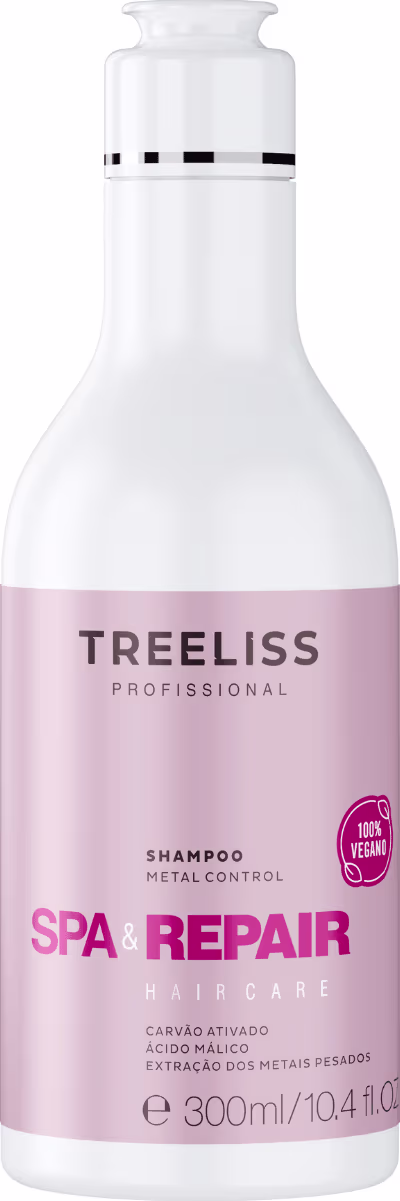 Shampoo Metal Control Spa e Repair Treeliss Profissional: Proporciona limpeza profunda e altamente eficaz, removendo impurezas, trazendo saúde e preparo aos seus cabelos, sendo excelente para proteger os fios antes de processos de coloração ou descoloração.