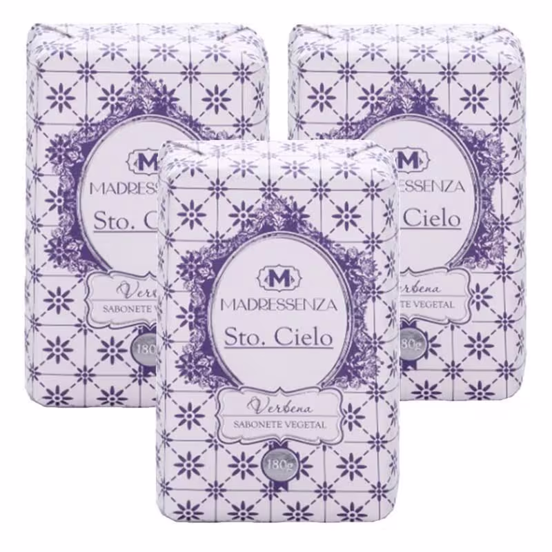 Sabonete vegetal Sto. Cielo Verbena, com peso de 180g é um sabonete em barra, da Coleção Sto. Cielo, feito artesanalmente pela Madressenza e especialmente desenvolvido para despertar o sentimento de bem-estar, proporcionando maciez à pele, tornando-a mais sedosa e iluminada. O aroma que exala das verdes folhas da planta selvagem de aparência humilde e multicolorida é encantador, um aroma inimaginável, fresco que acalma e envolve em uma atmosfera de energias equilibradas. Mesmo possuindo aromas únicos, dependendo da extração e das substâncias, cada fragrância possui uma estrutura fixa que se divide em 3 etapas, que significam exatamente a ordem pela qual elas se evaporam, sendo elas: notas de saída (cabeça), notas de coração (corpo) e notas de fundo (base).
