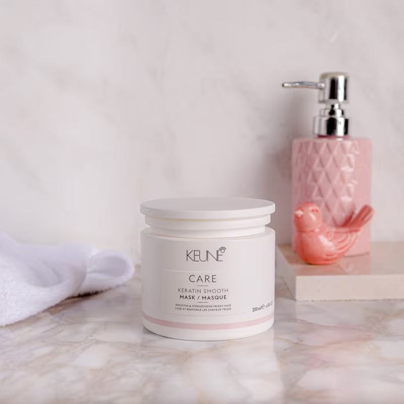 Keune Care Keratin Smooth - Máscara 200ml: reparadora traz tratamento intensivo de cabelos finos, com mechas e alisados. A Keratin Smooth Mask fortalece, hidrata, recupera a maleabilidade dos fios e realça o brilho. A tecnologia Silsoft protege e repara o cabelo do frizz, sem deixá-lo pesado.