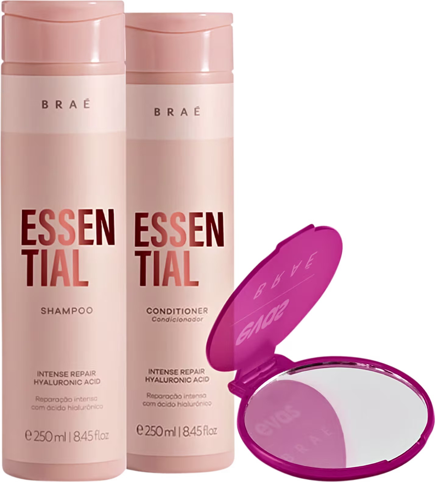 Braé Essential - Shampoo 250ml: limpa reparando os fios danificados, promove hidratação progressiva e protege o cabelo contra agressões diárias e térmicas. Com ácido hialurônico, aminoácidos e complexo de óleos, os cabelos ficam mais fortalecidos.