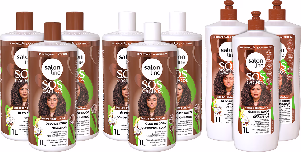 O Combo Família Kit S.O.S Cachos Coco com Ativador de Litrão conta com 3 Shampoos, 3 Condicionadores e 3 Ativadores de Cachos S.O.S Cachos Coco Tratamento Profundo. Juntos, proporcionam hidratação, nutrição, ação antiressecamento, brilho extremo, controle do frizz e definição. Dermatologicamente testados e com filtro UV.