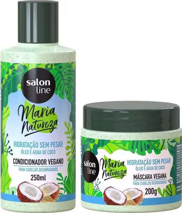 O Kit Salon Line contém 1 Condicionador e 1 Máscara da linha Maria Natureza Hidratação Sem Pesar O´leo e A´gua de Coco que, juntos, proporcionam hidratação profunda, ultradesembaraço, brilho intenso, fios selados e megamacios.