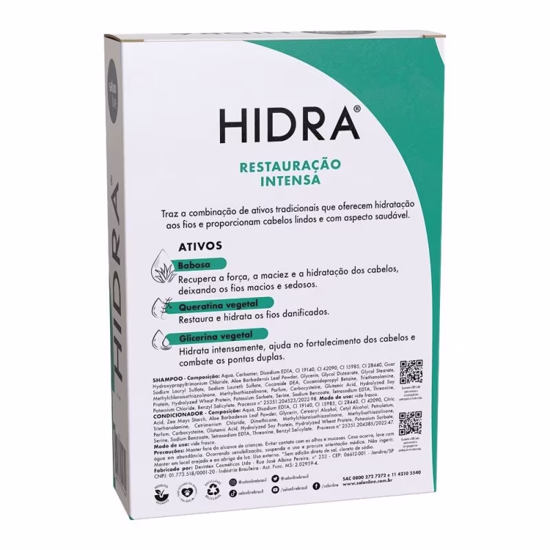 Kit Shampoo e Condicionador Hidra Babosa Babosa: rica em vitaminas para o cabelo, minerais e aminoácidos, a babosa garante fios fortes, hidratados e saudáveis. Queratina: restaura e hidrata os fios, auxiliando no tratamento dos cabelos danificados. Glicerina vegetal: auxilia no fortalecimento dos fios e combate as pontas duplas.