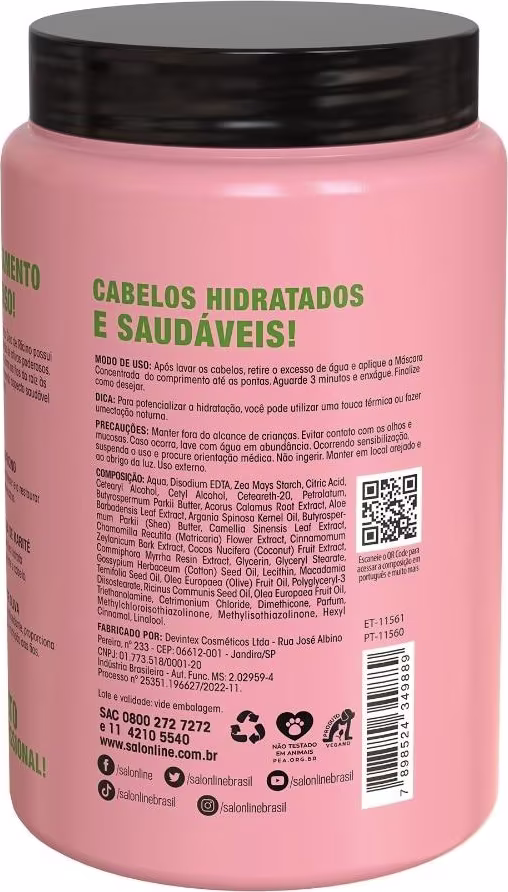 Máscara Concentrada S.O.S Hidratação Turbinada Manteiga de karité: hidrata e nutre profundamente o cabelo. Óleo de rícino: tem ação intensiva nas fibras capilares, fortalecendo os fios danificados. Azeite de oliva: poderoso antioxidante, garante a força e hidratação intensa.
