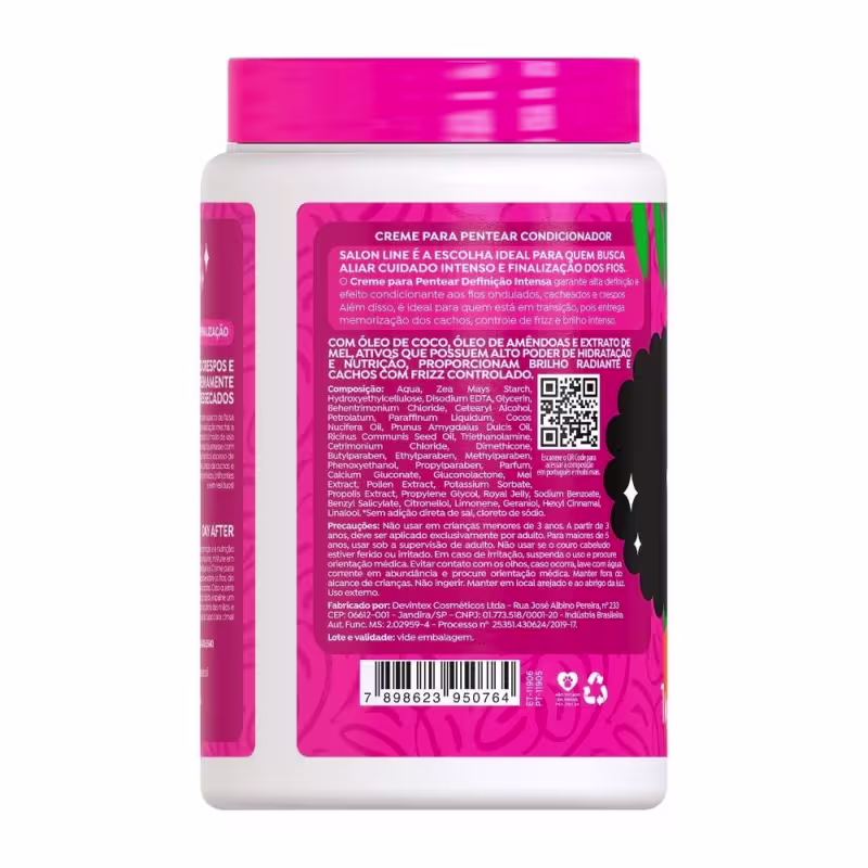 CREME PARA PENTEAR DEFINIÇÃO INTENSAÓleo de coco: rico em vitaminas para o cabelo e ácidos graxos, fortalece os fios e proporciona brilho e maciez extrema. Óleo de amêndoas: possui propriedades nutritivas que recuperam o cabelo, proporcionando força e definição. Também auxilia na redução do frizz, sela as cutículas e garante brilho e maciez. Mel: rico em vitaminas, sais minerais e aminoácidos, o mel possui ação fortalecedora e ultra-hidratante. Também possui ação antioxidante e protege os fios.