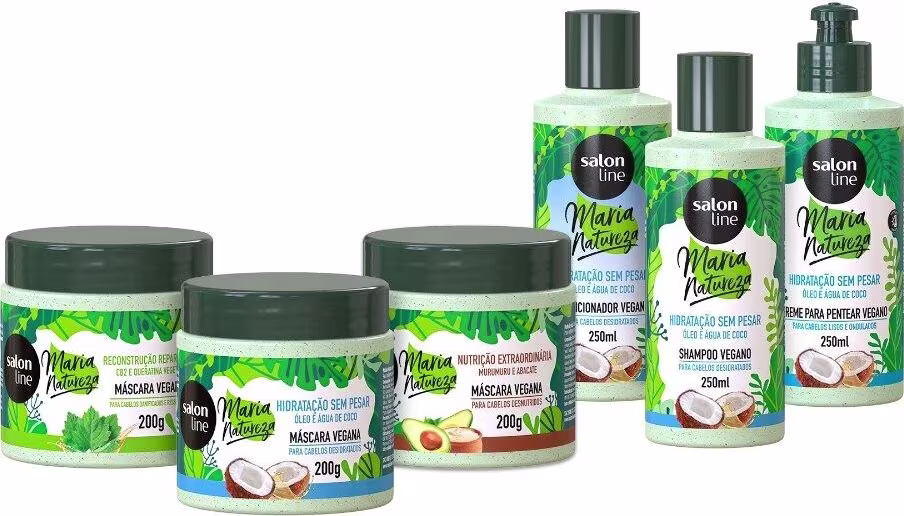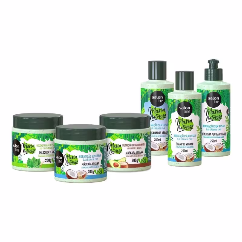 O Kit Salon Line conta com conta com 3 Máscaras de Hidratação Maria Natureza, sendo 1 Hidratação Sem Pesar Óleo e Água de Coco, 1 Nutrição Extraordinária e 1 Reconstrução Reparadora, 1 Shampoo, 1 Condicionador e 1 Creme para Pentear Maria Natureza Hidratação sem Pesar Óleo e Água de Coco, além de 1 Necessaire Maria Natureza branca.