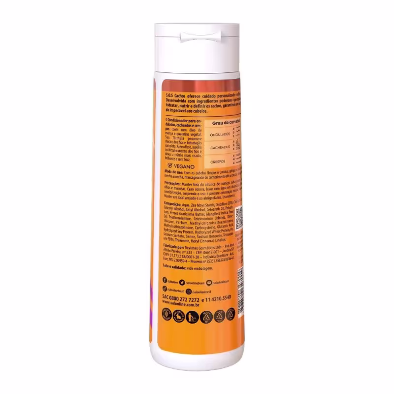 Condicionador S.O.S Cachos Óleo de Manga: após usar o Shampoo da Salon Line, aplique o condicionador uniformemente no cabelo molhado. Massageie e deixe agir de 1 a 3 minutos. Enxágue.