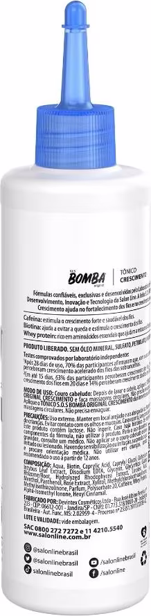 Tônico Fortalecedor S.O.S Bomba Whey protein: rico em aminoácidos essenciais que restauram a fibra capilar danificada. Biotina: ajuda a prevenir a queda, estimula o crescimento e fortalece os fios. Cafeína: estimula o crescimento saudável dos fios.