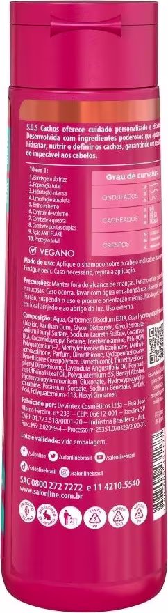 Silicone: proporciona brilho e sedosidade aos fios, forma uma película protetora, deixando os cabelos cacheados brilhantes, macios, hidratados e com as pontas seladas.