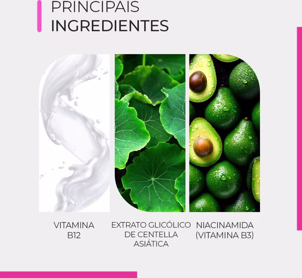 Fluido facial e corporal com Vitamina B12, auxilia no clareamento e uniformização cutânea, contribui para o controle da oleosidade e redução dos poros.