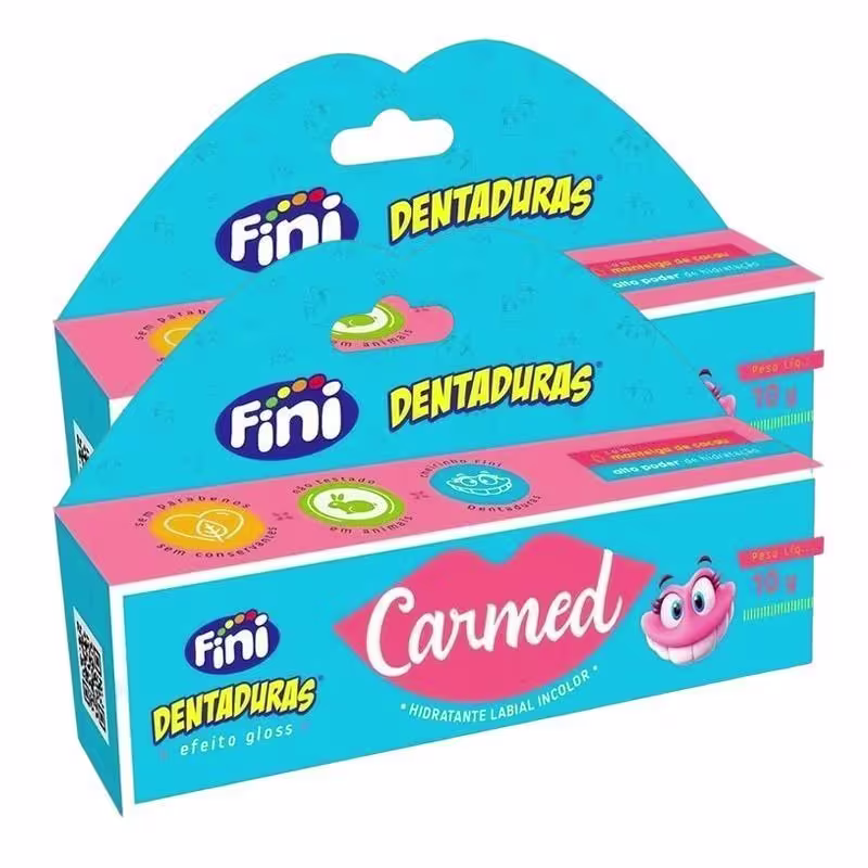 Carmed Fini Dentaduras é um hidratante labial de uso diário incolor com alto poder de hidratação. Protege contra o ressecamento, deixando os lábios macios e saudáveis e conta com o doce aroma de Fini Dentaduras. Incolor, permite seu uso com batom, e os produtos são livres de parabenos e conservantes, além de não serem testados em animais. Uso externo a partir dos 3 anos.