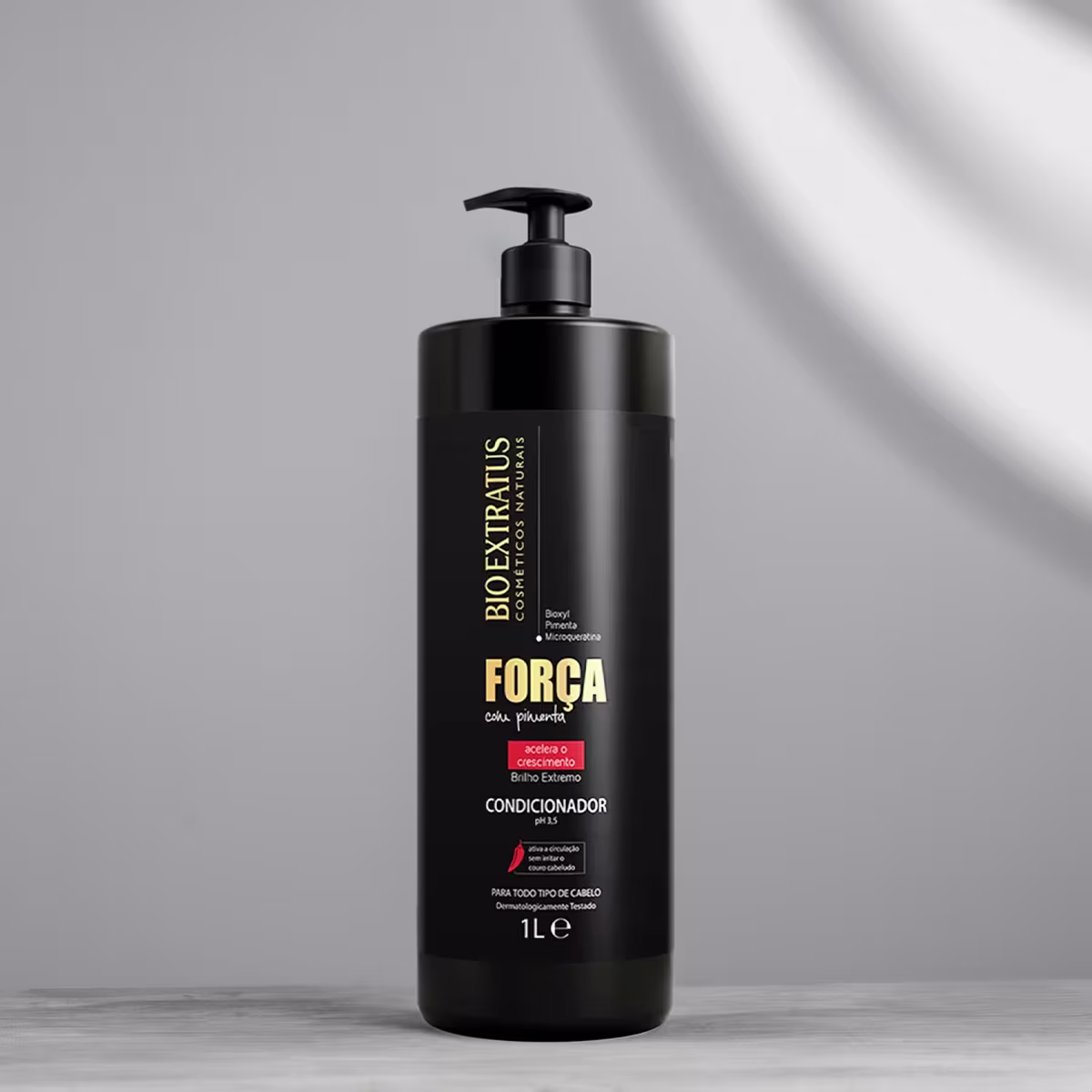 Bio Extratus Força com Pimenta - Condicionador 1L: ajuda no crescimento saudável do fio, deixando-os limpos e hidratados, conta com uma função que acelera o crescimento saudável devolvendo brilho e vitalidade ao cabelo enfraquecido. Indicado para todos os tipos de cabelo desenvolvido para condiciona imediatamente os fios, selando a cutícula assim ajudando a protege contra as agressões do dia a dia, deixando alinhado, disciplinado, macio e com um brilho natural. Com ph 3,5.