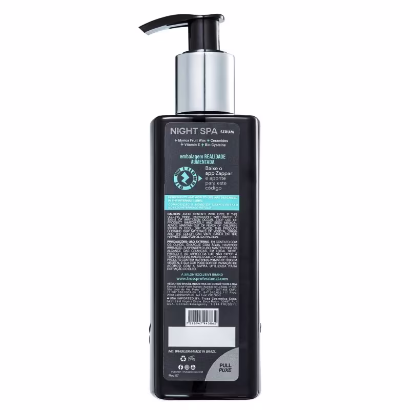 Truss Night Spa - Sérum de Tratamento Noturno 250ml: a fórmula possui cera vegana e promove uma verdadeira blindagem que mantém seus nutrientes dentro da fibra capilar. Hidrata os fios de forma intensa, proporcionando um selamento protetor, reconstrução, maciez e brilho.