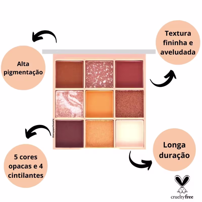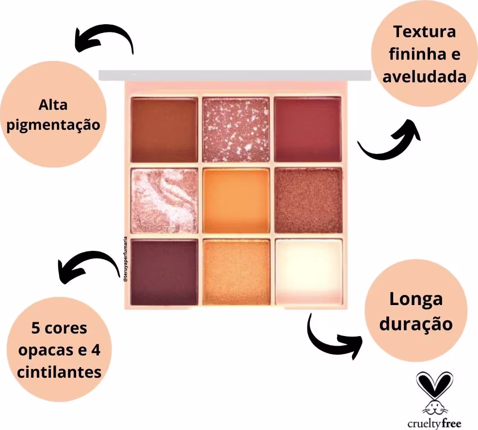 A Paleta de Sombras Hey Babe possui tons essenciais para você arrasar e criar diversas opções de make, com 5 cores opacas e 4 cores cintilantes para você escolher a sua preferida. Alta pigmentação, longa duração, textura fininha e aveludada, fácil de esfumar e entrega de cor igual a apresentada na paleta. Não testado em animais.