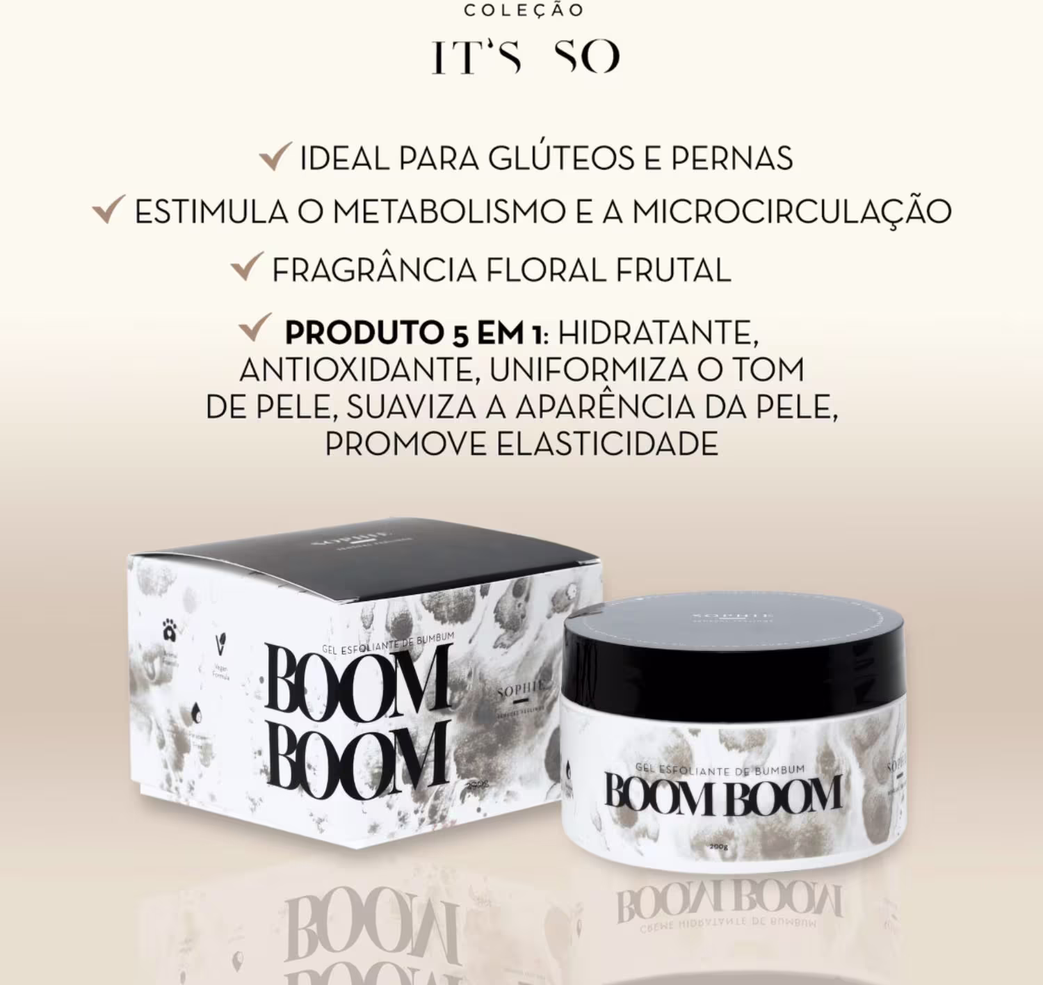 Pensando nisso, desenvolvemos o Boom Boom Creme Hidratante feito especialmente para o bumbum e para as pernas. Seu uso ajuda na estimular o metabolismo e ativar a microcirculação, proporcionando também uma hidratação de invejar e aquela elasticidade fantástica.